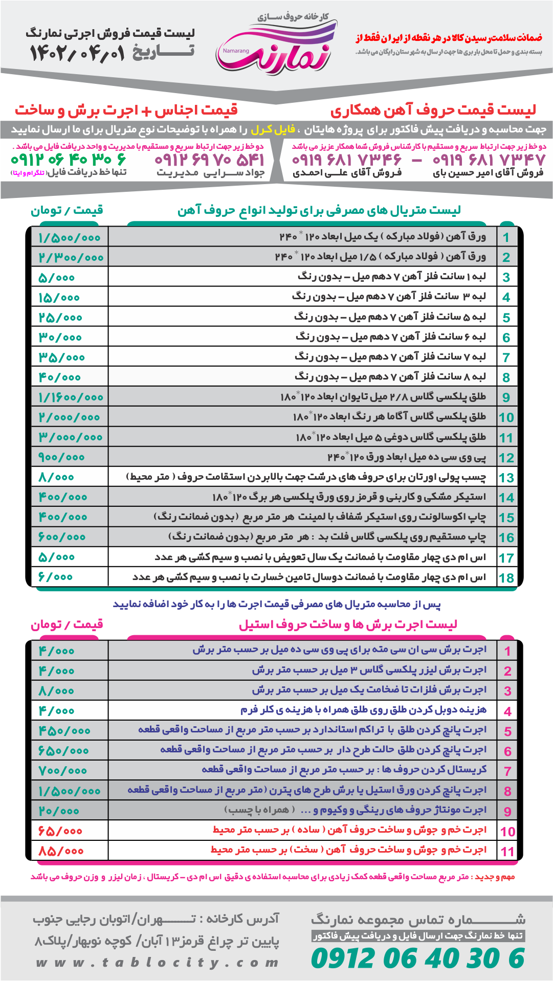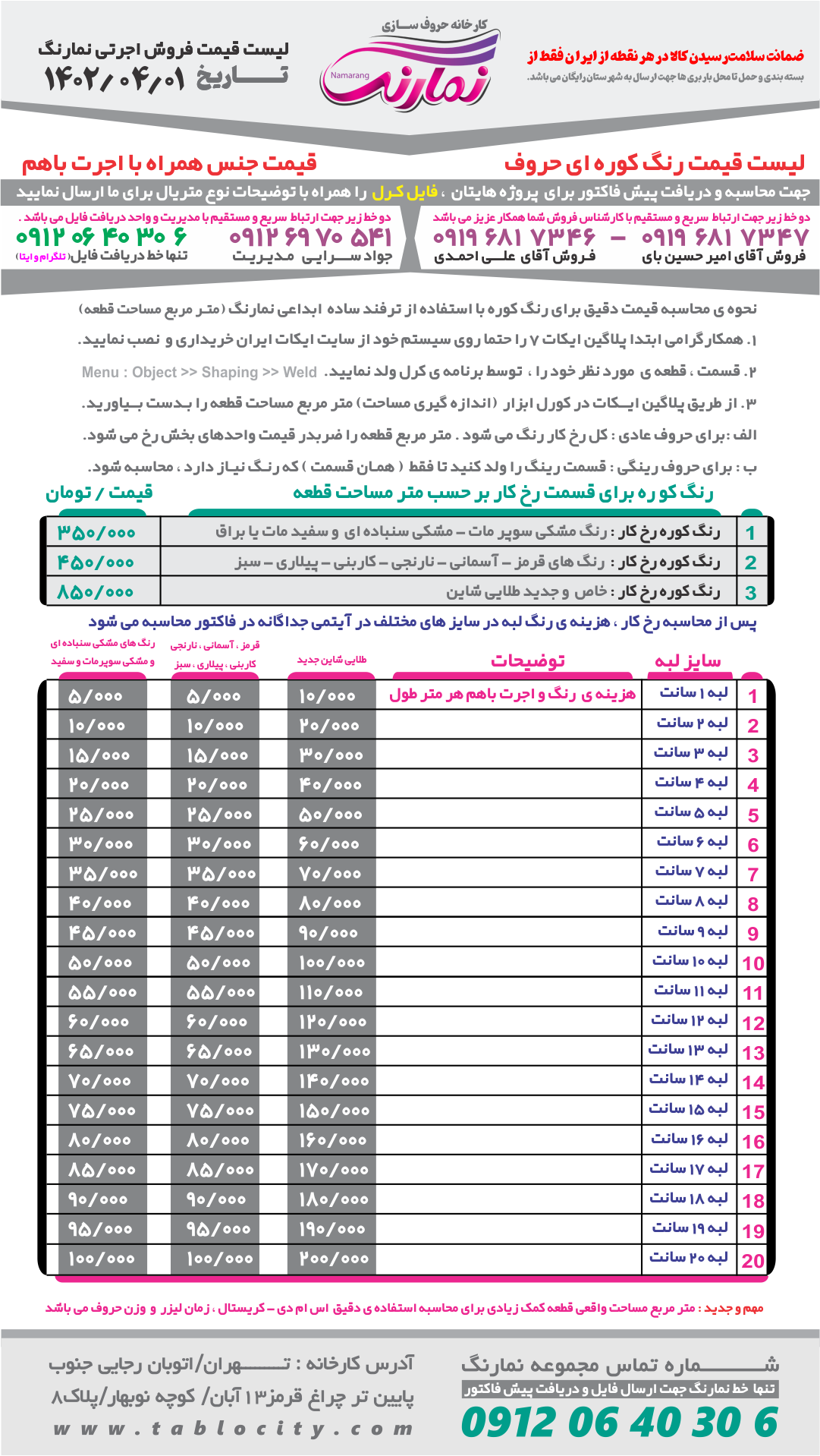 برای محاسبه قیمت رنگ حروف ها از قسمت پایین راهنمایی دریافت کنید